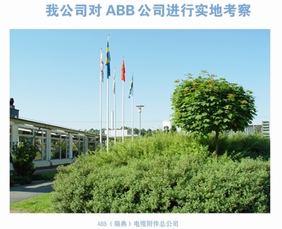 ABB電纜附件公司,位于瑞典西海岸的阿靈索斯,主要致力于構(gòu)建安全的電纜輸配網(wǎng)絡(luò),從事研發(fā)、生產(chǎn)并銷售各種電纜附件、開(kāi)關(guān)設(shè)備以及其他外圍設(shè)備。ABB電纜公司主要客戶是發(fā)電公司、電力公司、工業(yè)用戶以及OEM廠商。